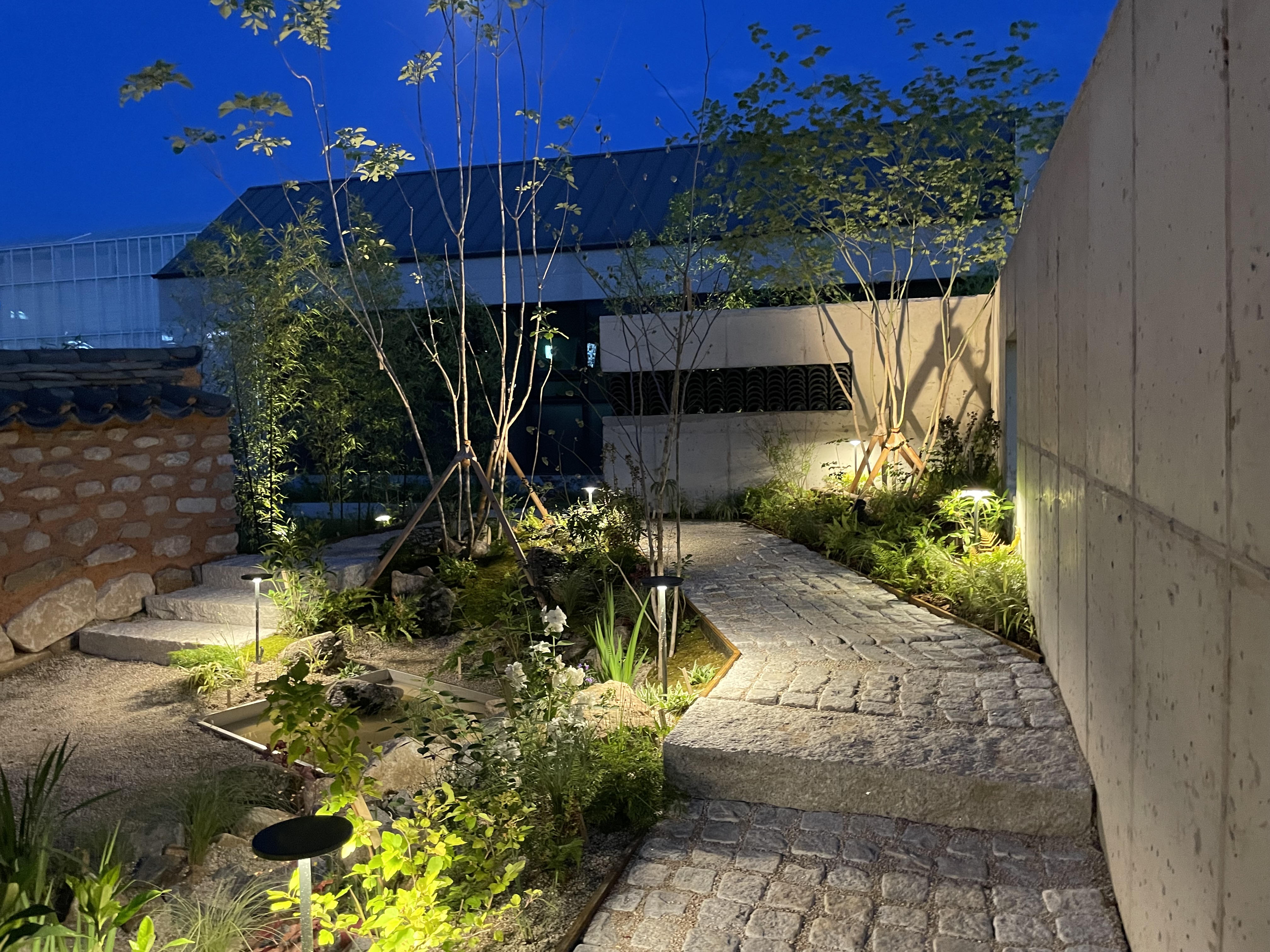 시설물 및 포장 : 수경시설, 통목의자, 철재엣지, 계단석 놓기, 이끼석 놓기, 사고석 포장, 왕마사 포설, 외부조명